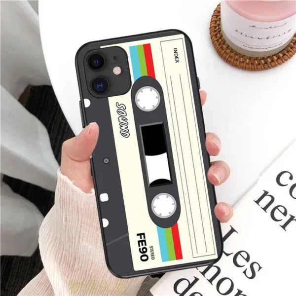 For iPhone 15 All Models Black TPU Case With Retro Cassette Print
